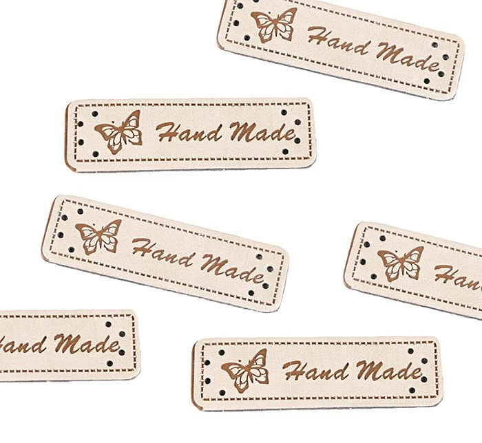 Viimeistele rakkaudella tehty käsityö keinonahkaisella Hand Made- merkillä. Neljä pientä kiinnitysreikää merkin molemmissa päissä.