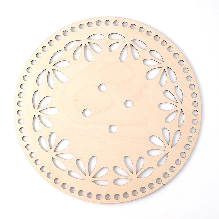 Käsittelemättömästä 3 mm puuvanerista laaserleikattu aihio virkkaus- ja makrameetöihin. Ulkoreunalla olevien reikien läpimitta 8mm.