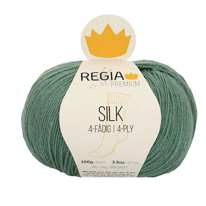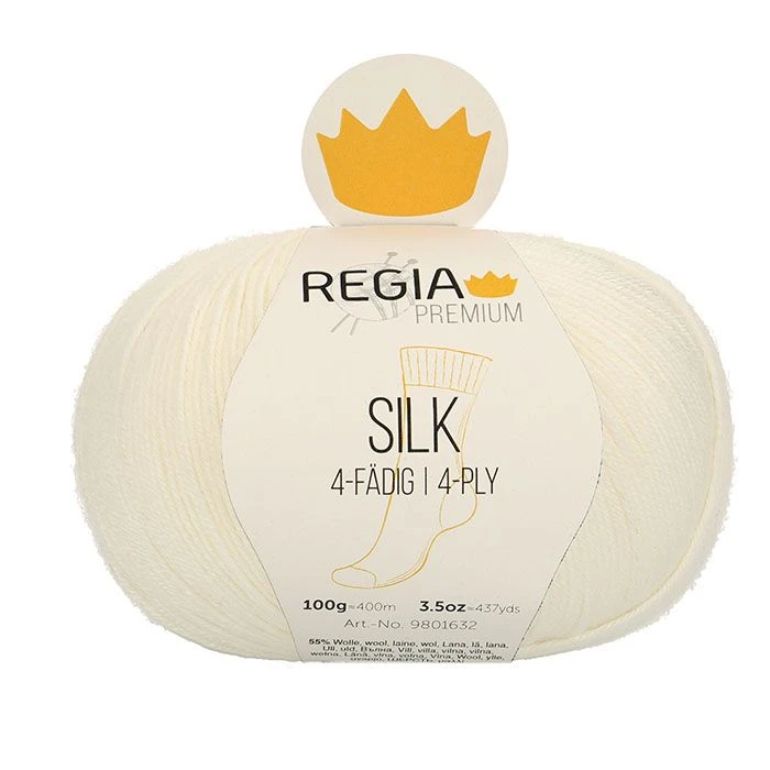 Regia Premium Silk on ylellinen sukkalanka merinovillaa, silkkiä ja polyamidia. Värjäämättömät silkkikuidut luovat lankaan hienoisen meleeratun sävyn. Pehmeä ja ihoa hellivä lanka sukkiin tai muihin neuletöihin.